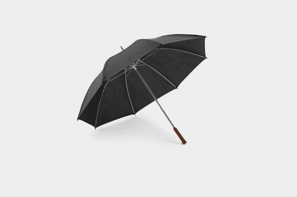 Guarda-chuva de golfe em poliéster 190T e pega em madeira. Abertura manual.
